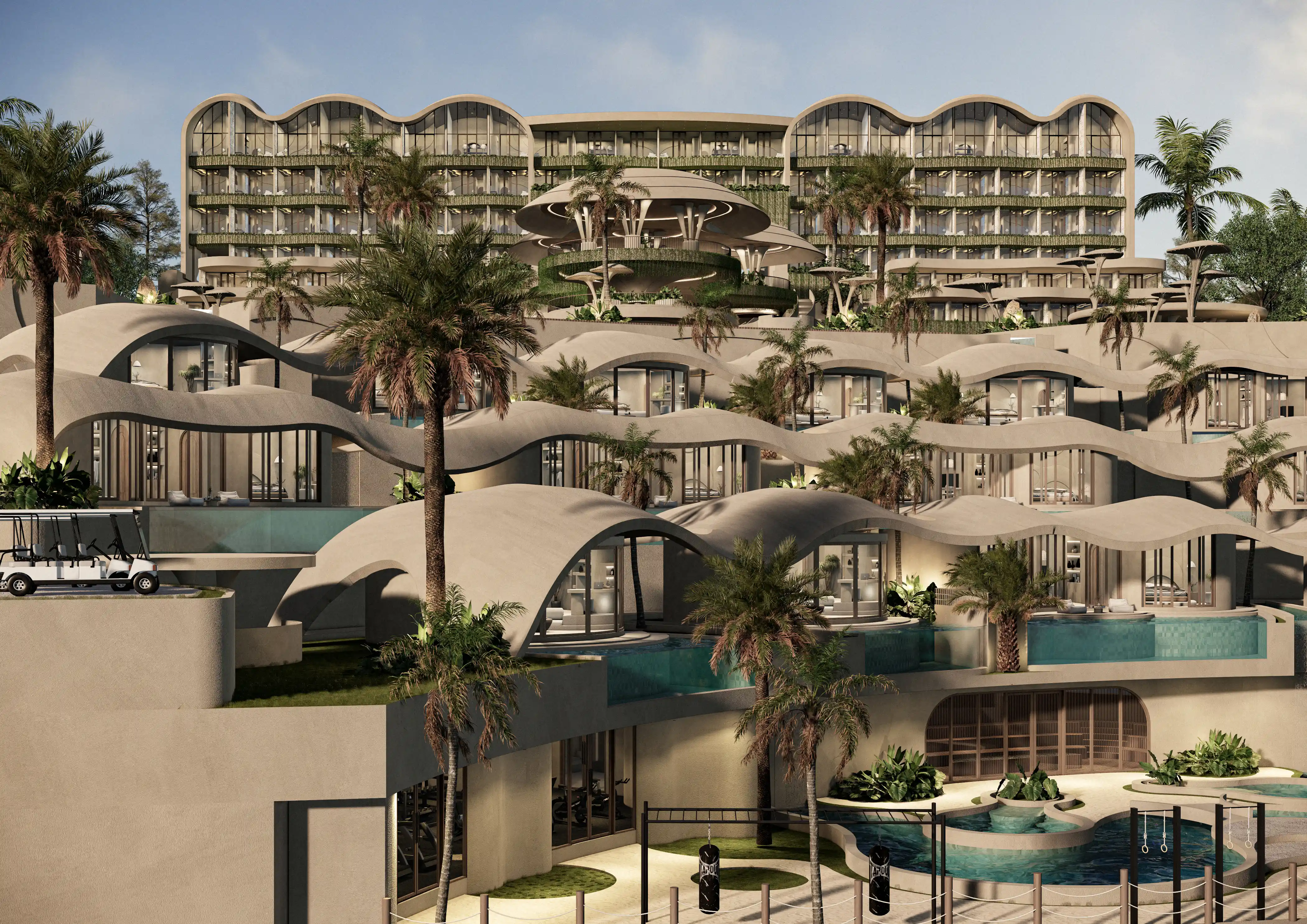 Spanning approximately 20,000 sqm across multiple levels, the development includes a mix of serviced residences, apartments, and villas supported by extensive wellness, dining, and lifestyle infrastructure. Unlike smaller boutique villa projects, it is structured as a centralized resort with unified branding, operations, and guest experience standards.